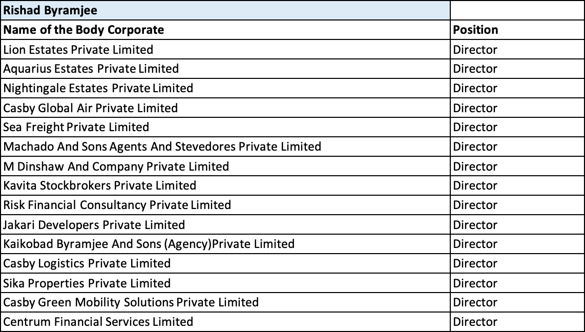 Mr. Rishad K. Byramjee is the Managing Director of the Casby Logistics Group of Companies since 2003. Established in 1857, the company is a market leader in Stevedoring and Port Services business in India.  He has a Master of Science degree with a specialization in Logistics and Supply Chain Management from the UK. Under his leadership, the company expanded its Logistics operations from a regional scale to a pan-India scale within the business verticals of Air, Sea, Surface and Rail Cargo movement. He leads the diversification and expansion program at Casby and has successfully initiated new businesses such as Hazardous Liquid Bulk Transportation, Logistics Solution Design, Warehousing and Refrigerated solutions. He is also involved in the growth of the other Group offerings that include Construction & Real Estate Development, Digital Security & Surveillance, Telecommunications and Software Development.